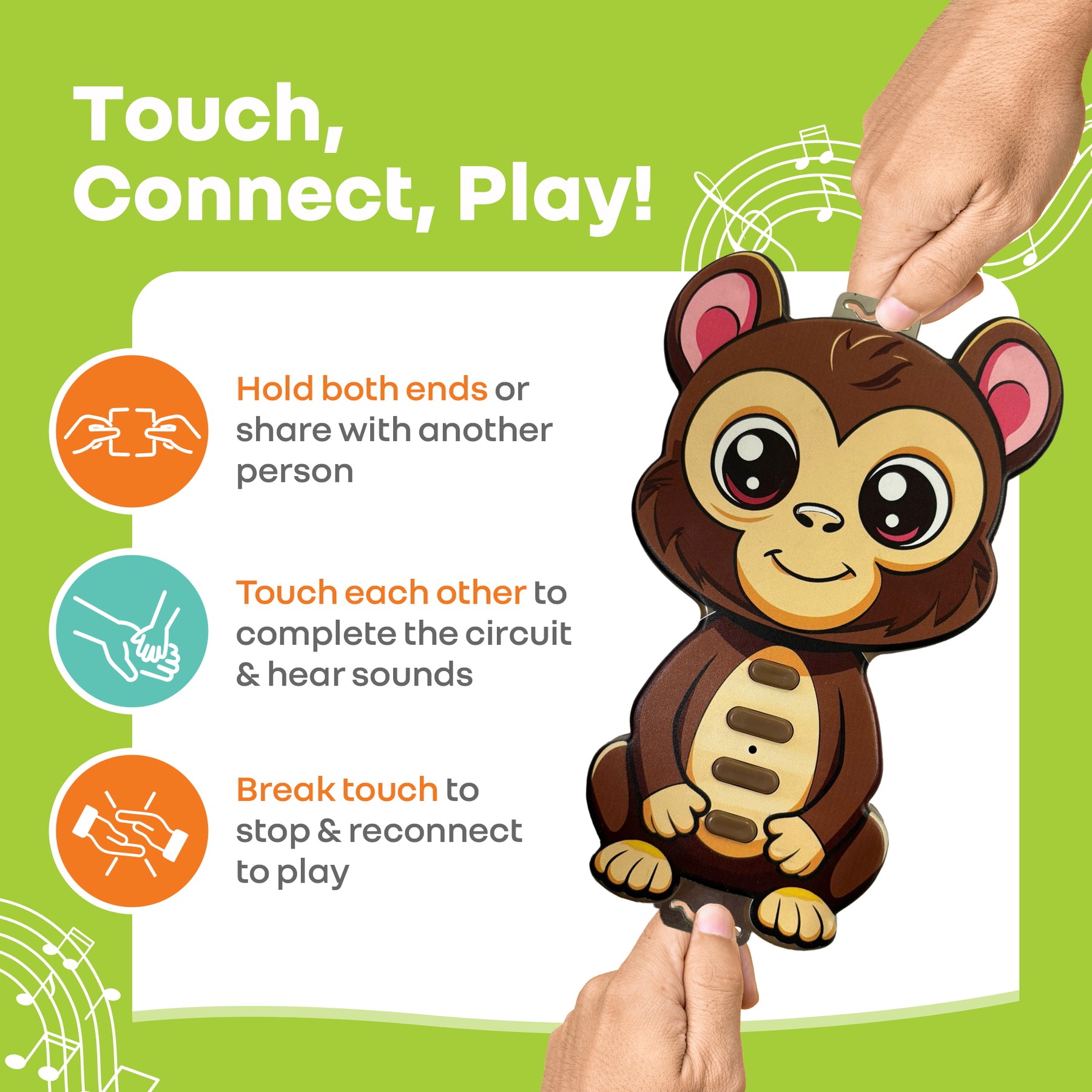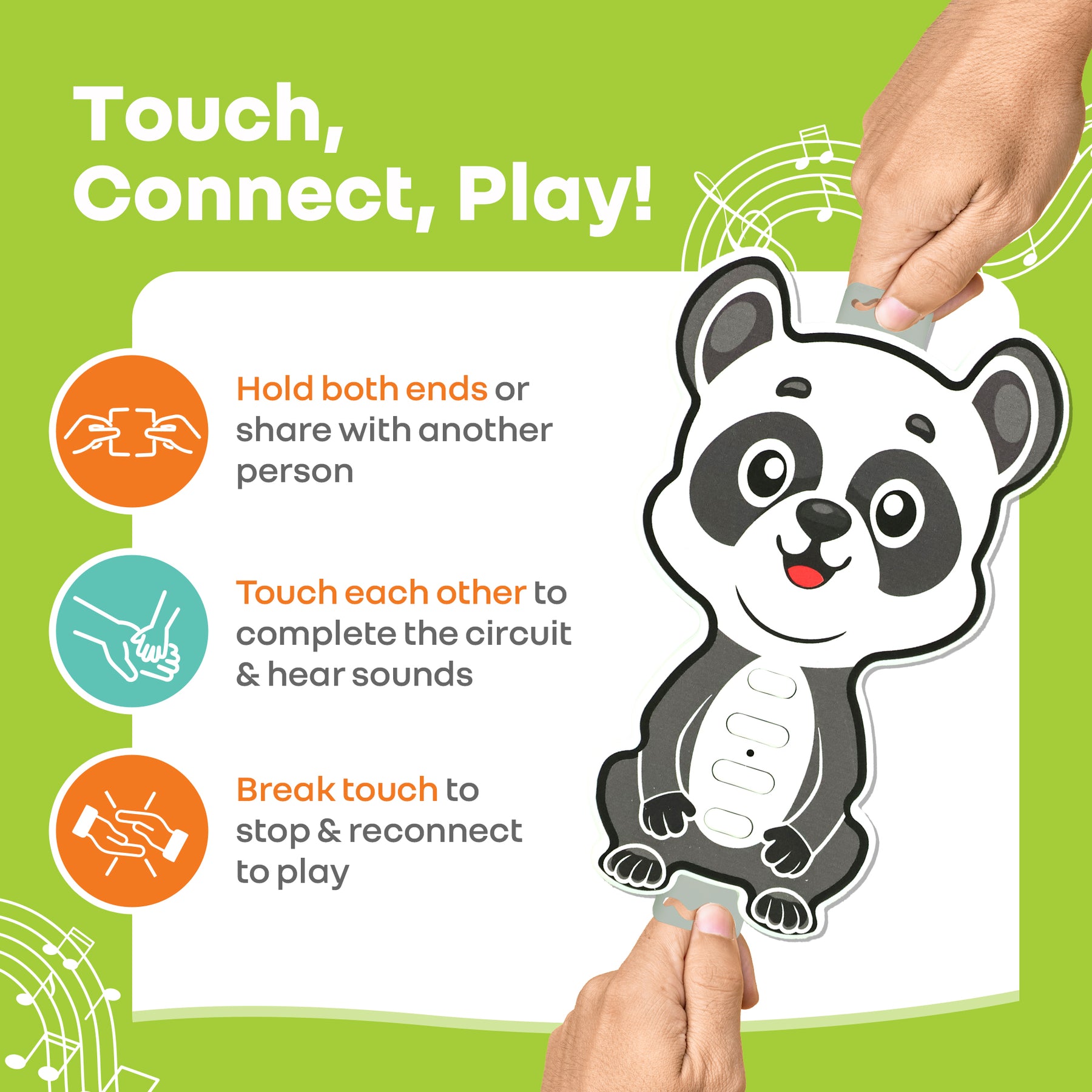 How To Play: R for Rabbit's Tap N Play involves the players to hold both the ends themselves or share with one or multiple friends. The touch completes the circuit. Now activate the sounds and break contact to pause and so on. It can be played solo, in pairs, or even in a group.