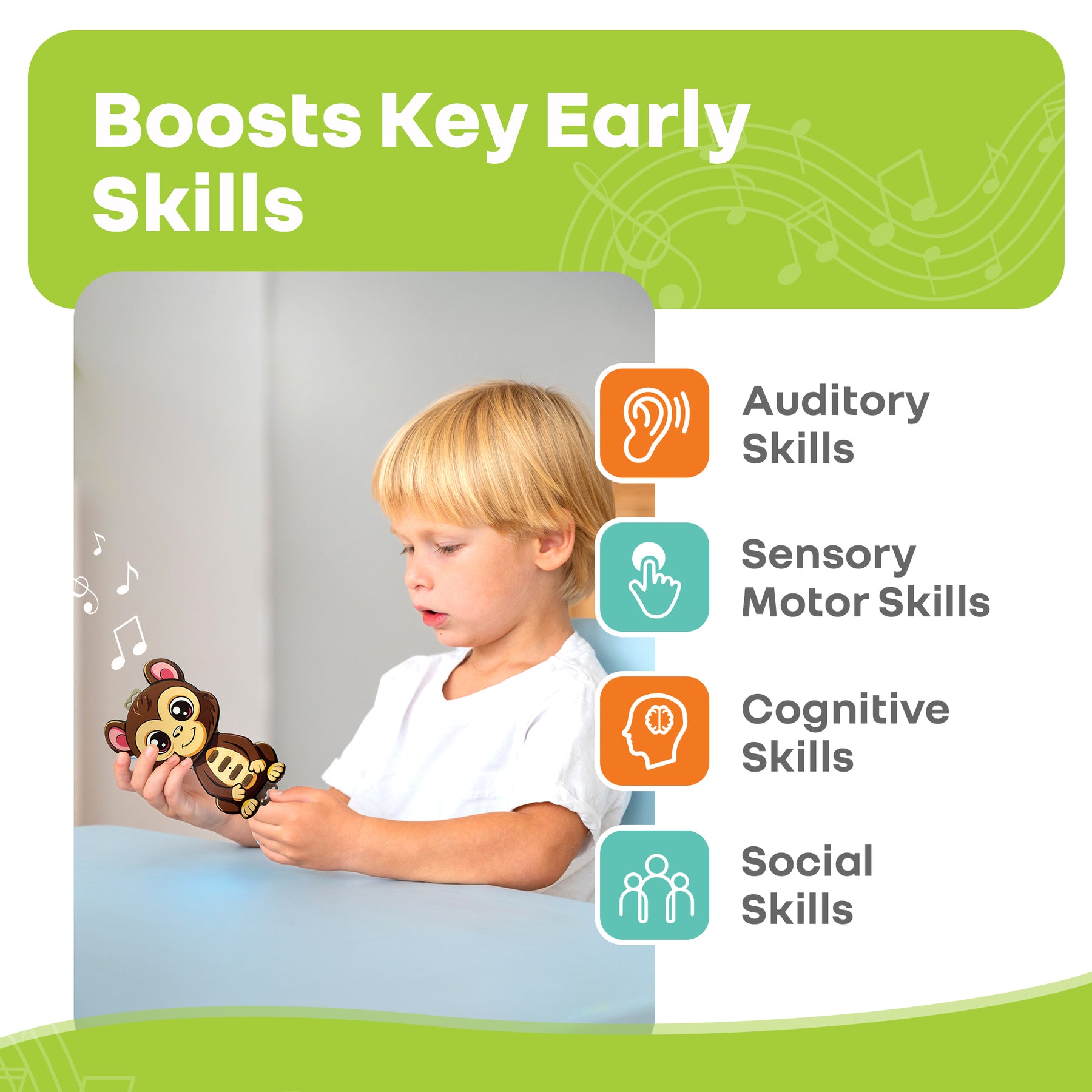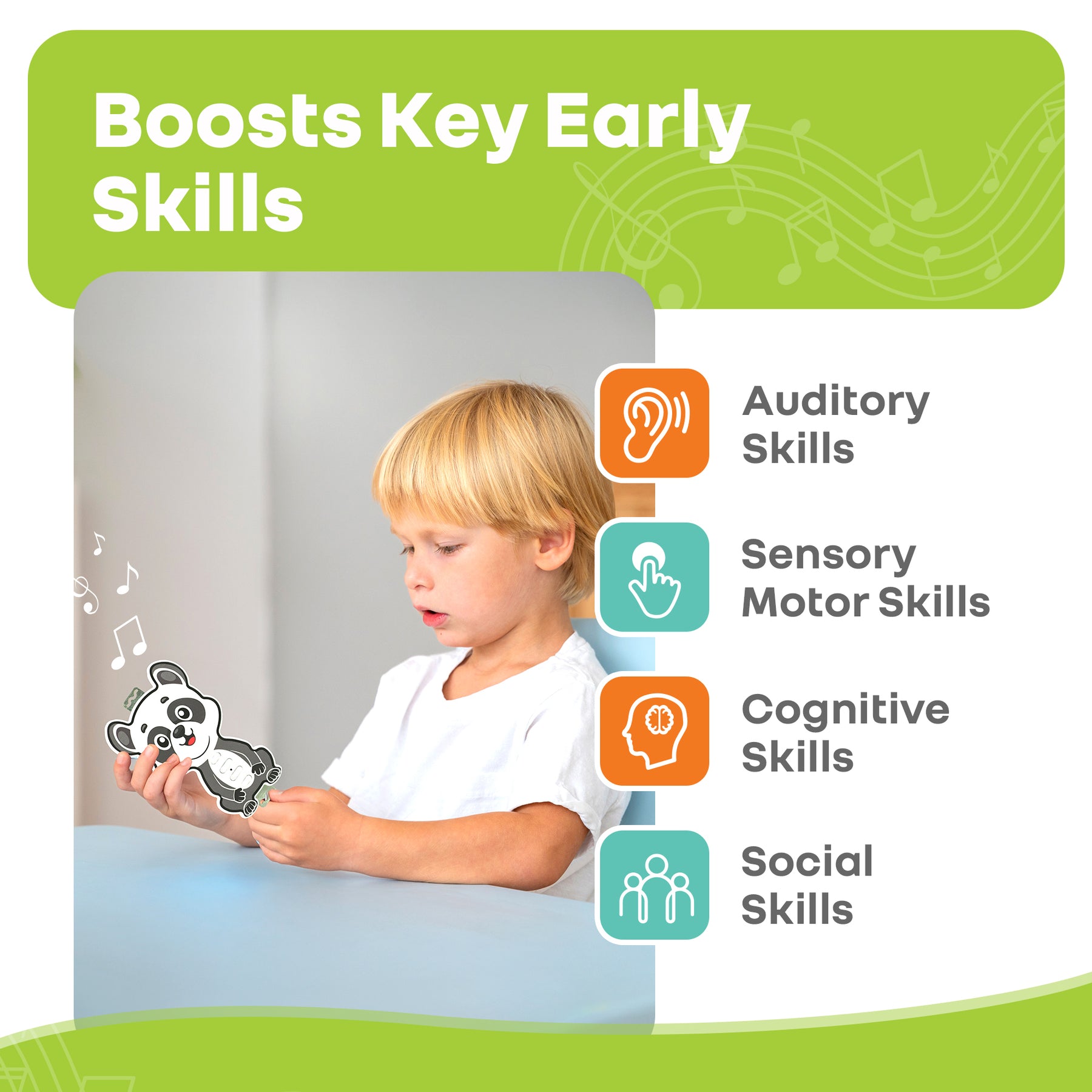 Multi-Skill Development: It helps in boosting the children’s auditory, sensory, motor, cognitive, and social skills, thus enhancing their memory, attention, and problem-solving skills, through interactive touch and movement during the plays.