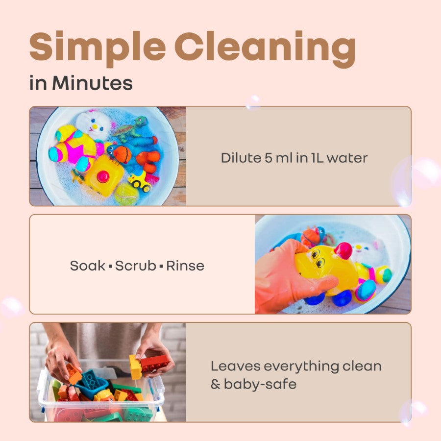 Powered by Bio-Enzymes: This cleanser comprises bio-enzymes power with the presence of enzymes like protease, lipase, and amylase. This further helps break down stubborn milk film, grease, and food particles into easy-to-wash components. It also ensures hygiene with every feed without the presence of harmful chemicals.
