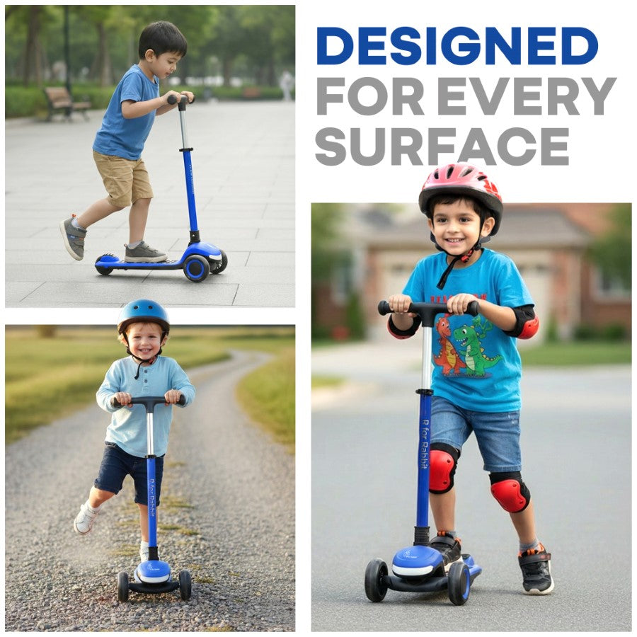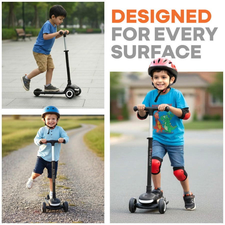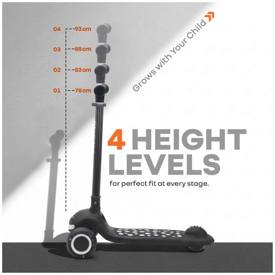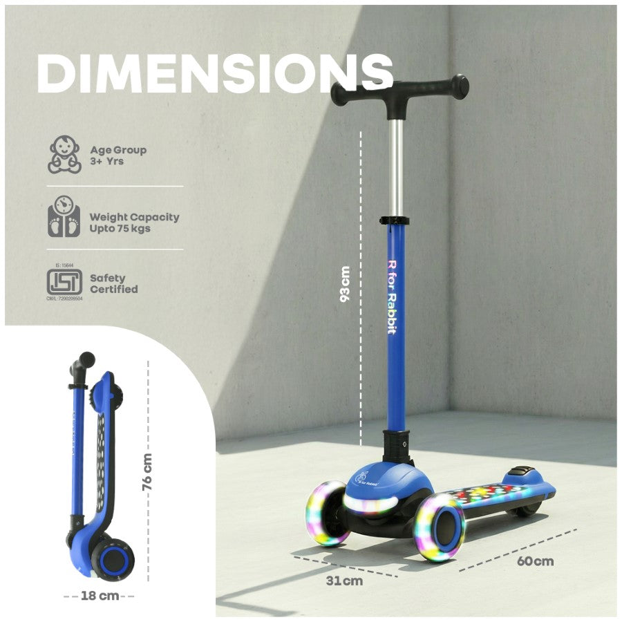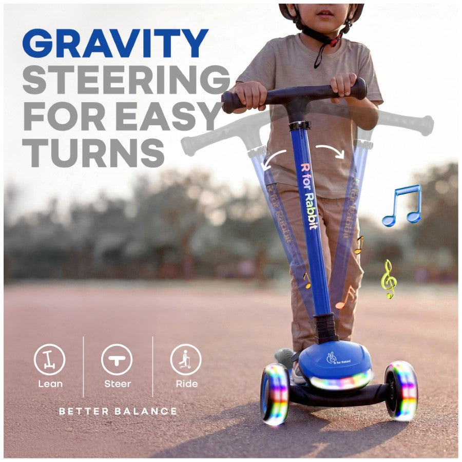 RR for Rabbit is introducing Road Runner Jazz, the scooter that doesn’t just roll, but also rocks. It is designed for little thrill-seekers with big style, and inbuilt lights for extra fun. With glowing wheels, funky tunes, and smooth-as-butter movement, it turns every scoot into a parade of fun. Also, the durable PU LED wheels with ABEC7 bearings provide an effortless movement, which aren’t just flashy, but also tough to handle every twist, turn, and tiny pebble in your path. It also has anti-slip wide footrest for strength and stability, while the gravity steering makes turning smoother than butter. And when it’s time to wrap up the fun, the smart fold design enhances it within a matter of seconds. In addition, it also has four-levels of height adjustments to make it adaptable with the child’s growing age.