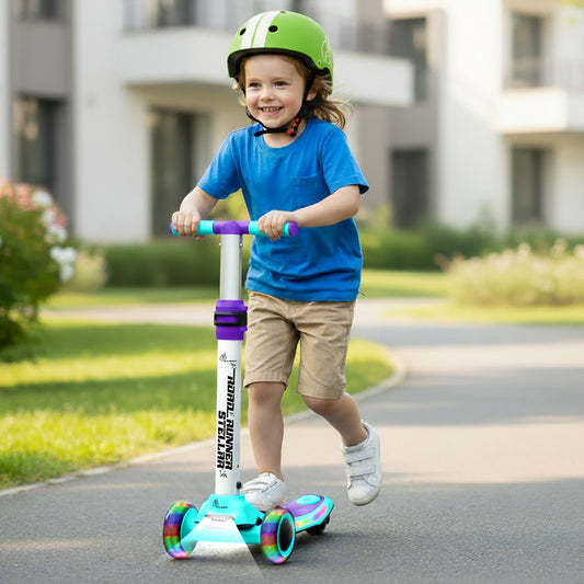 Our road runner scooter comes in multiple colours and is designed to specifically ensure that children can ride without knowing how to balance. The wide 3-wheel design makes this easy for children of all levels. With PU wheels that make it safe to ride indoors and LED wheels that are bright enough to be seen during the day, so you do not need to worry about safety. And with strong brake pedals, it is one of the best kids scooters on the market.