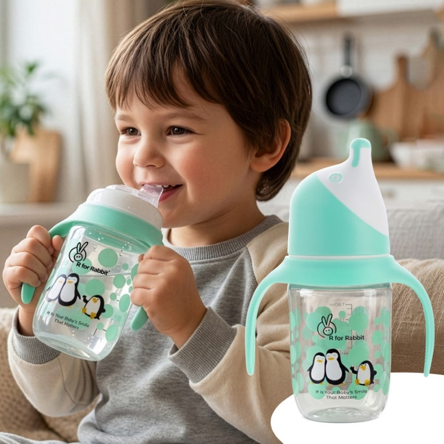 Is it the time for your cute munchkin to sip on? R For Rabbit brings to you Penguin Spout Cup Made with Food Grade Poly Propylene Material to make the sipping time easier. Penguin Spout Cup is made of BPA Free and Phthalate Free Poly Propylene Material & the soft spout is made of soft silicone material which is absolutely safe for your cute little one. The cute penguin-shaped design makes the bottle more appealing as a toy to kids and makes it more adapted as a playful cute pal by the child. 2 side handles help the child to be independent of parents and enjoy the liquid time on his/her own. The soft silicone spout is flexible so that the child gum’s or cute lips will do not get any harm. The spout cup is designed that it is leak-proof and make the drinking time hassle-free for baby and parent!
