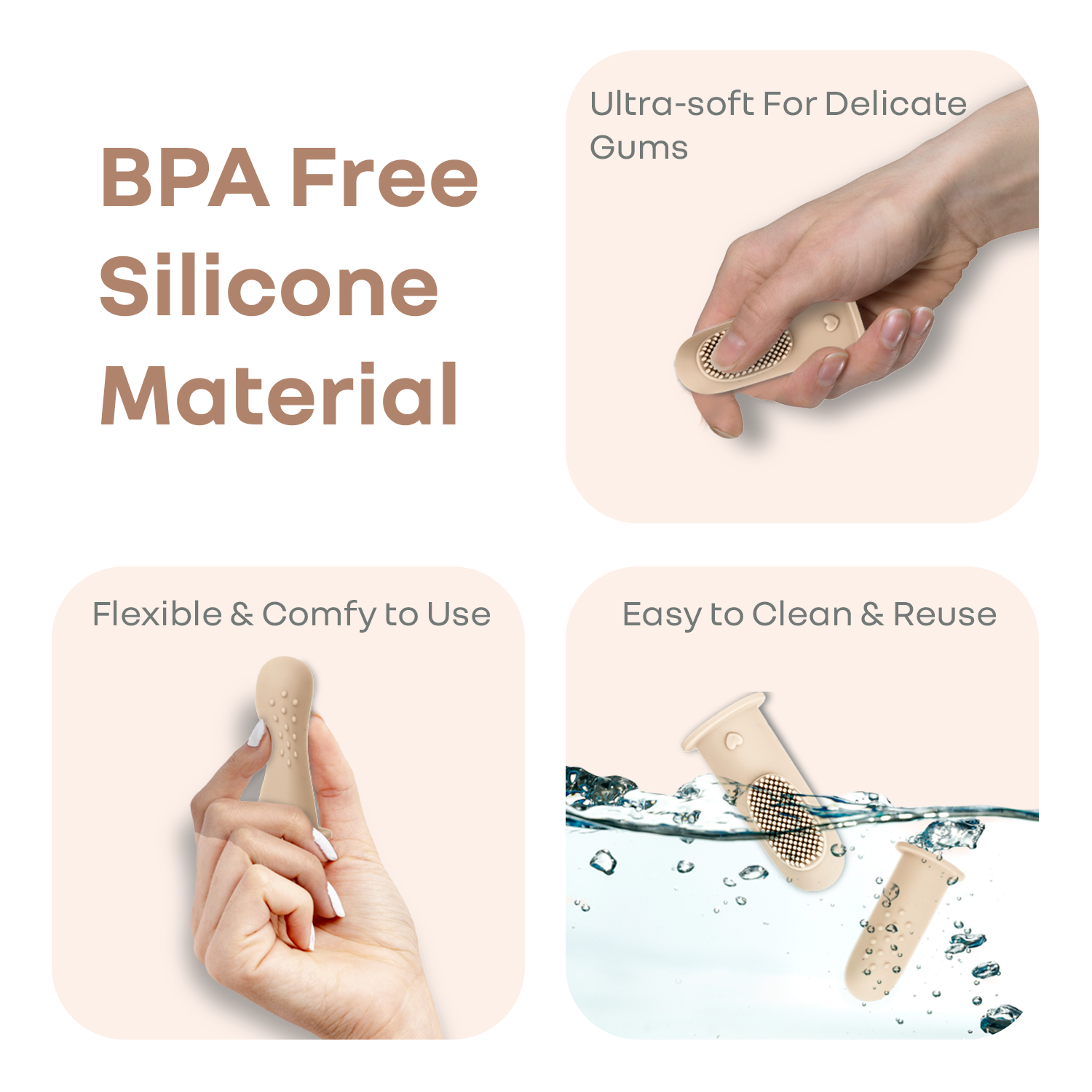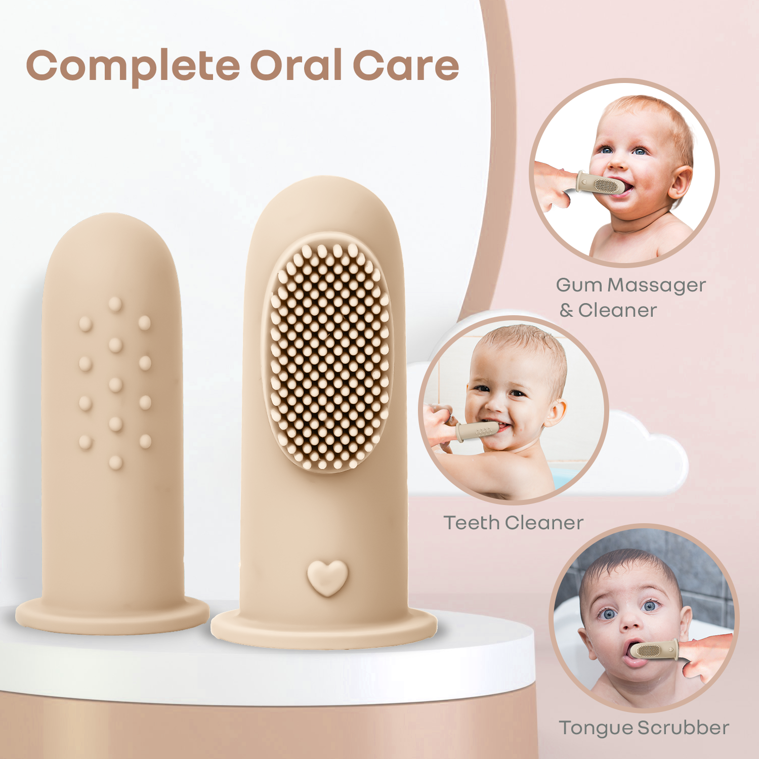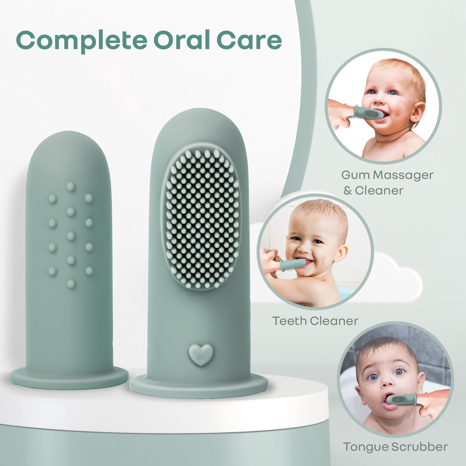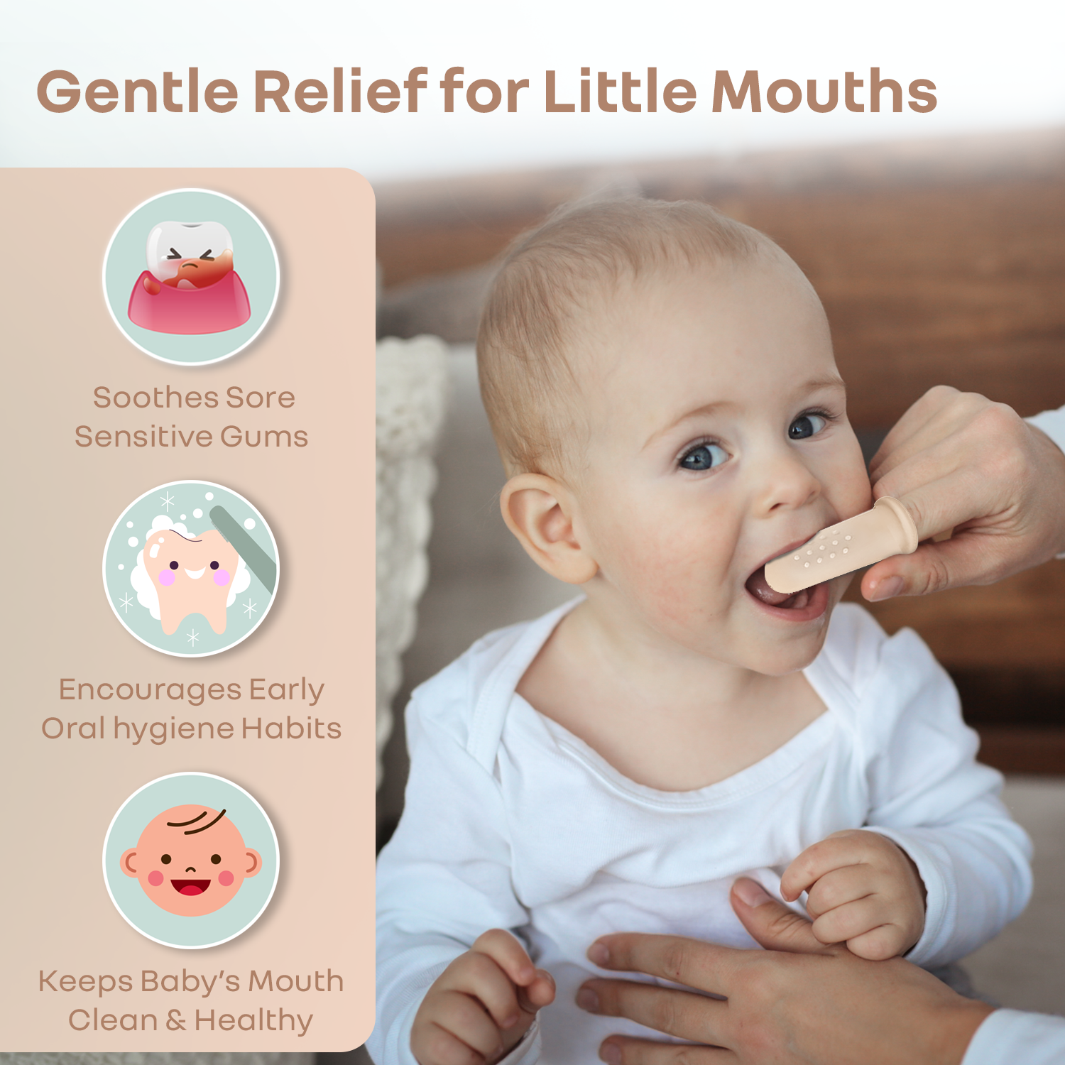 Complete Oral Care: It helps massage gums, clean babies’ teeth and scrubs tongue, all at once. It's varying patterns also helps to massage the gums optimally, providing the necessary comfort. This further supports early oral hygiene, relieves teething discomfort, and encourages chewing and oral motor development.