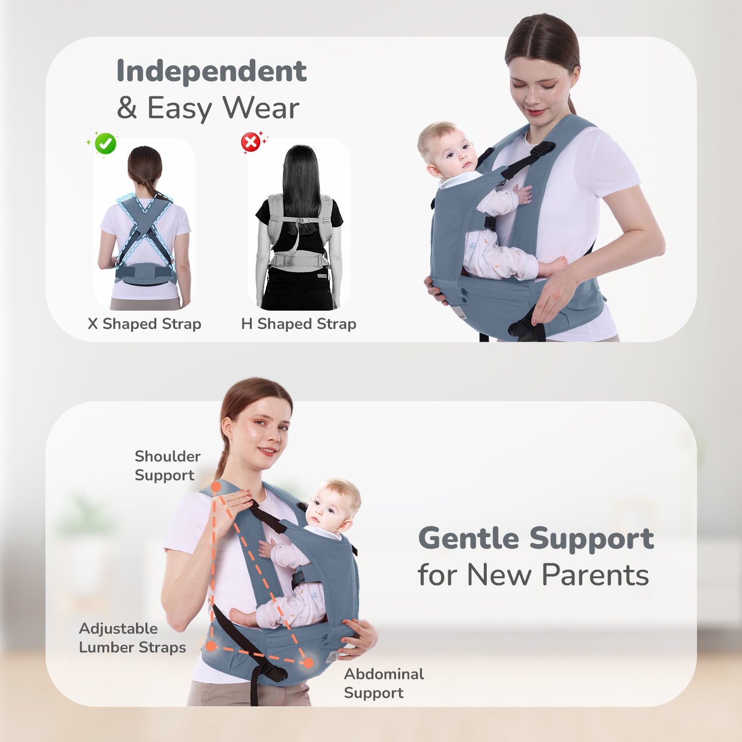 Say hello to R for Rabbit’s Upsy Daisy Cozy with 5-in-1 Hip Sit Baby Carrier, your spine’s new best friend and your baby’s personal VIP lounge. It is crafted with soft, super lightweight, and breathable fabric with soft cushion belts for added protection. It also has built-in pockets to store the essentials like pacifiers, mobile devices, keys, etc. Whether your little explorer wants to face the world or snuggle in, the detachable hip seat has the solution to every option, making the baby less fussy. Also, the adjustable lumbar support and the independent hip seat provide a comfy fit for both the parent and the baby while also relieving the lower back pressure. Lastly, the ergonomic natural “M” position also provides the baby with the necessary support for their healthy hip muscle development. It is safe, soft, efficient, and ergonomic. Order Now!