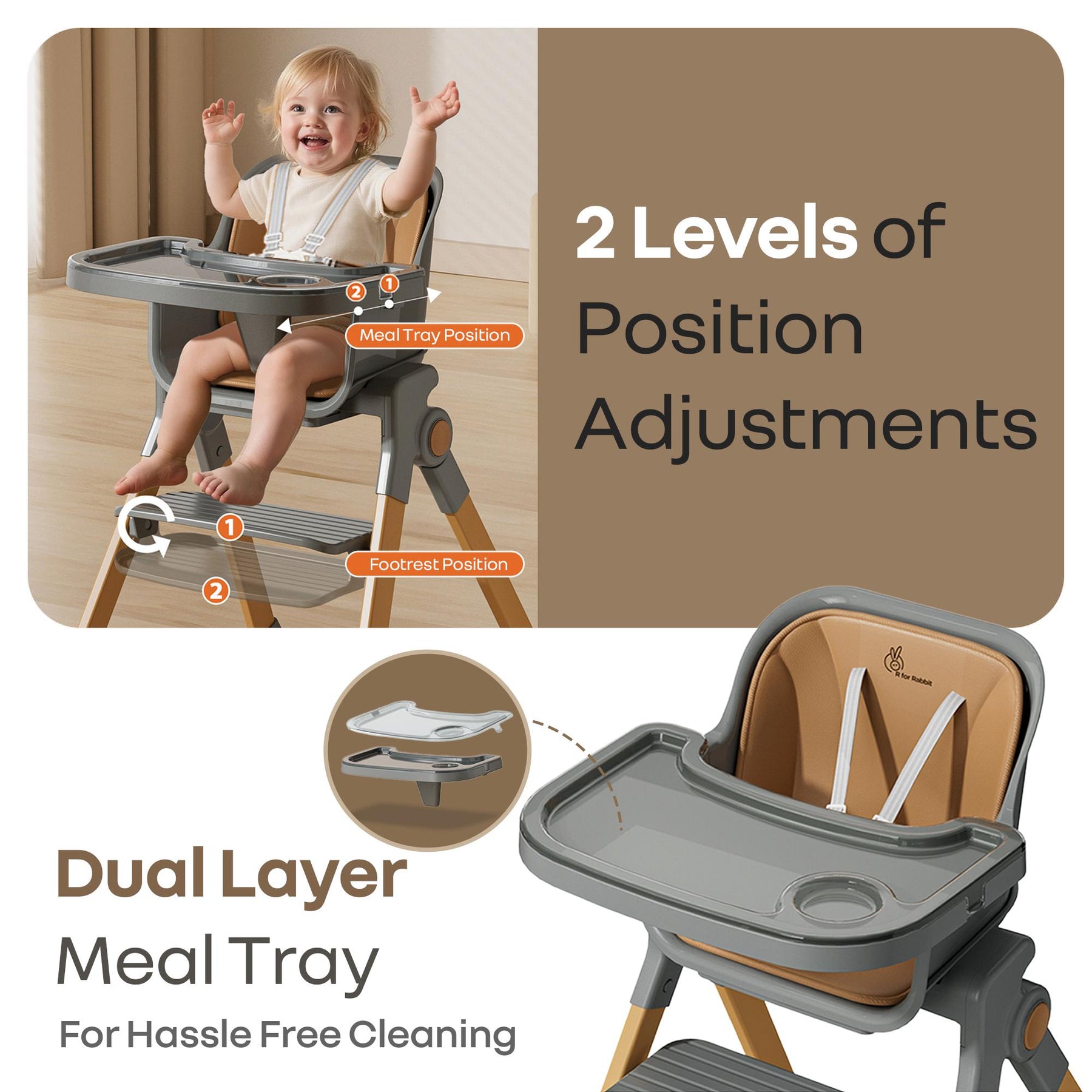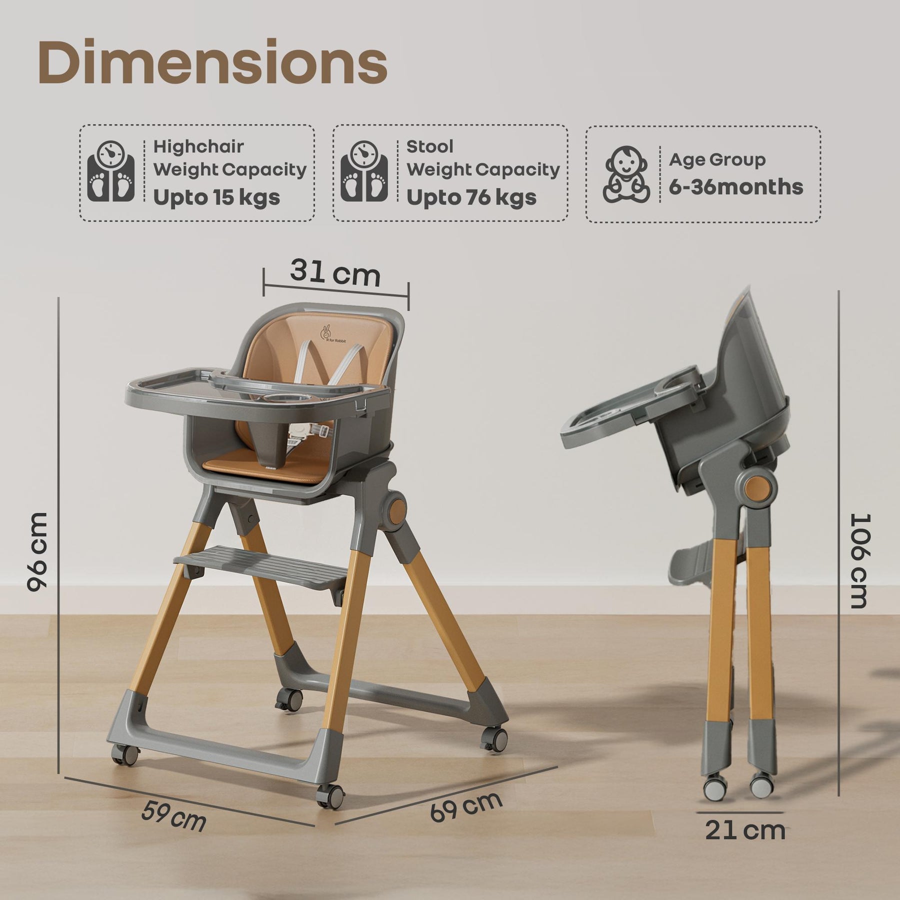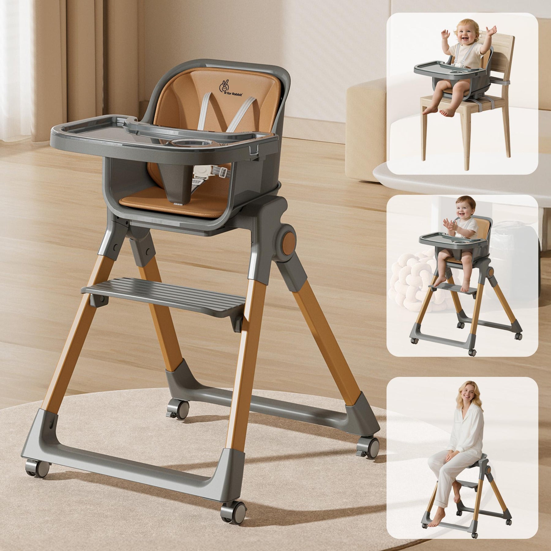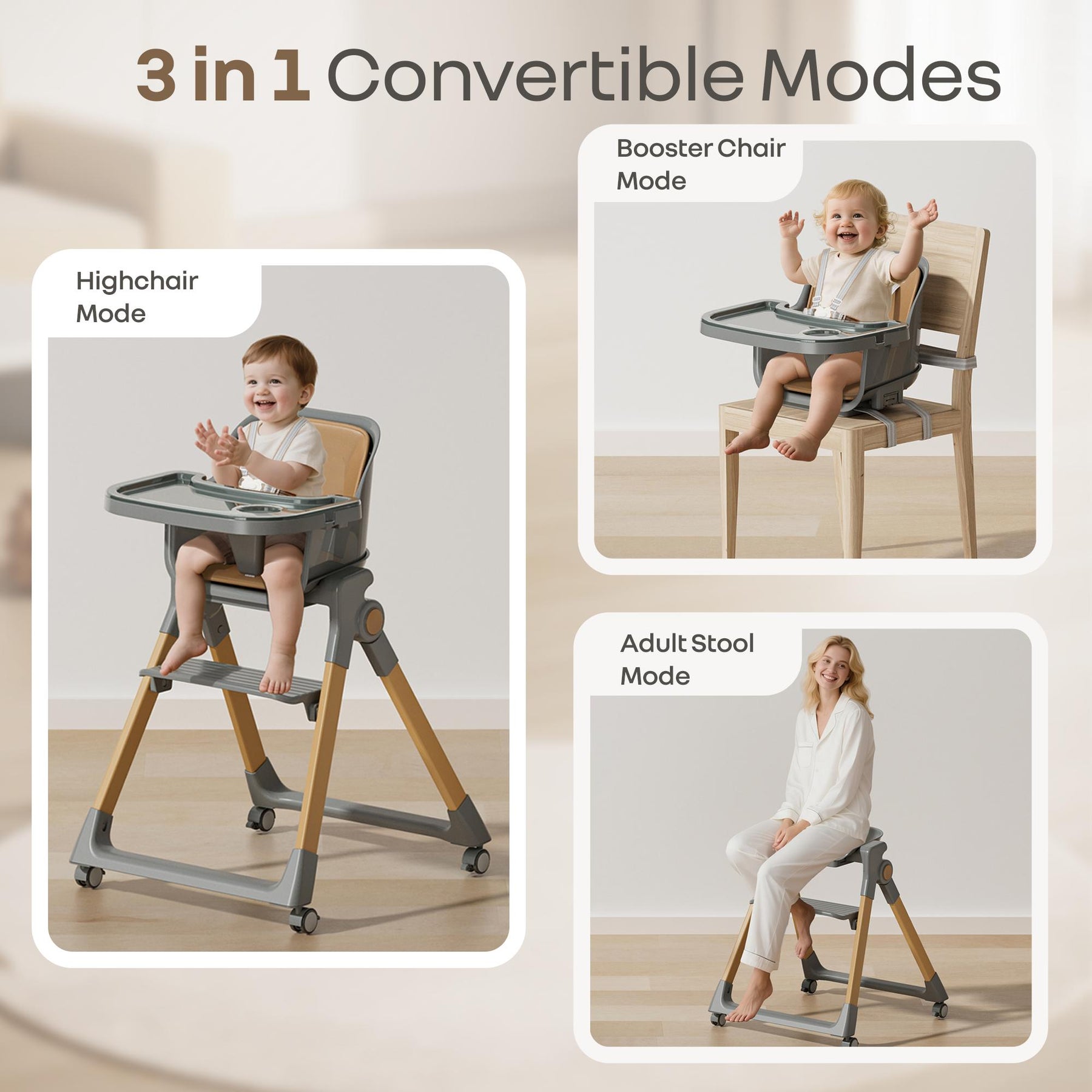Walnut High Chair - 3 in 1 Convertible kids Highchair with Booster & Stool